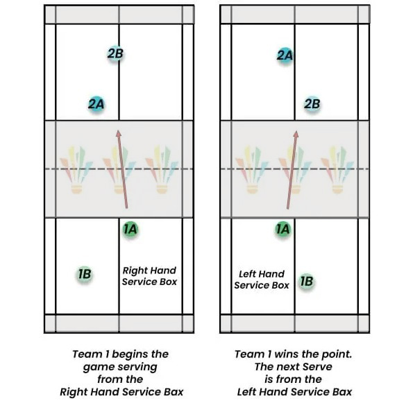 Au début du set et chaque fois que le score est pair, le serveur sert à droite. Si le score est impair il sert à gauche. Si le serveur gagne l’échange il marque le point et sert dans la zone alternative.Si le receveur gagne l’échange, il marque un point et prend le service.