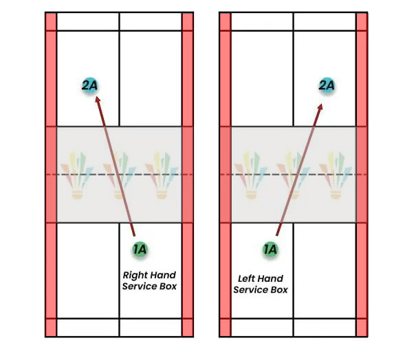 Au moment de la frappe, la raquette doit être inclinée vers le bas et le volant doit être frappé sous la taille. La taille est une ligne imaginaire située au niveau de la partie la plus basse de la dernière côte du serveur.